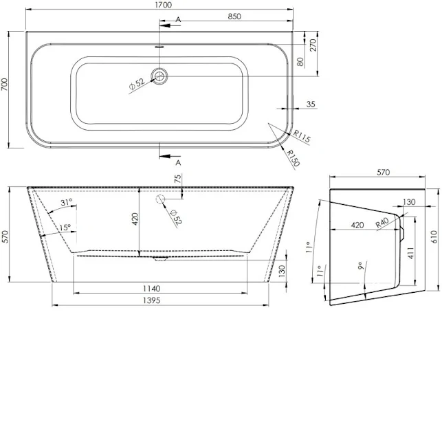 - 1700 x 700mm freestanding double ended bath