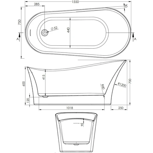 - 1550 x 750mm freestanding single ended slipper bath